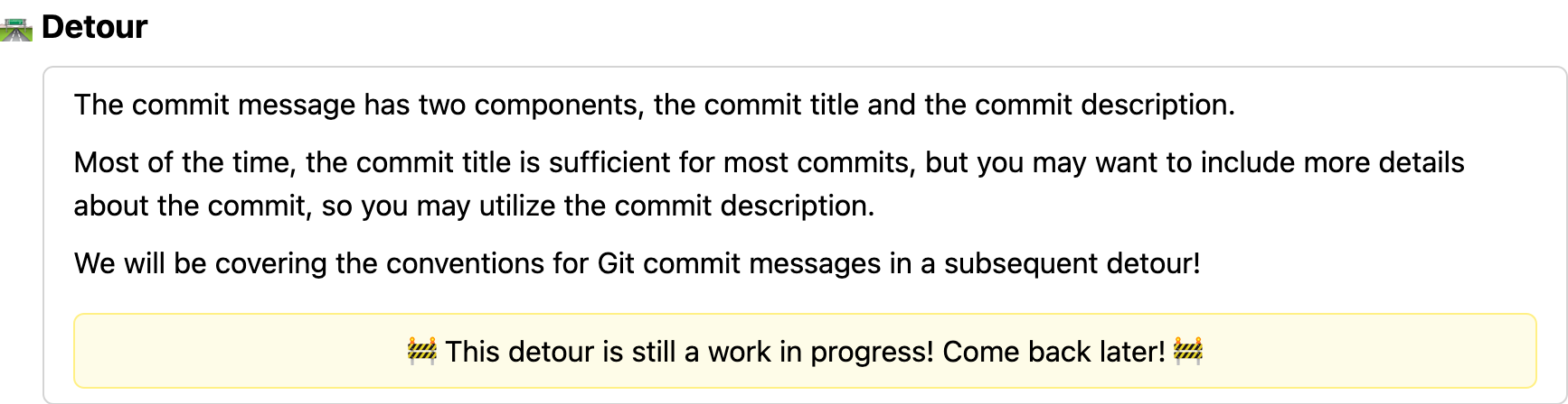 | Creating snapshots (via commits) How do I save the changes made as a part of the repository's history? | 🧤 Hands-on: Staging files for snapshot 🛣️ Detour: git commit message conventions 🧤 Hands-on: Creating a snapshot 🛣️ Detour: git log |