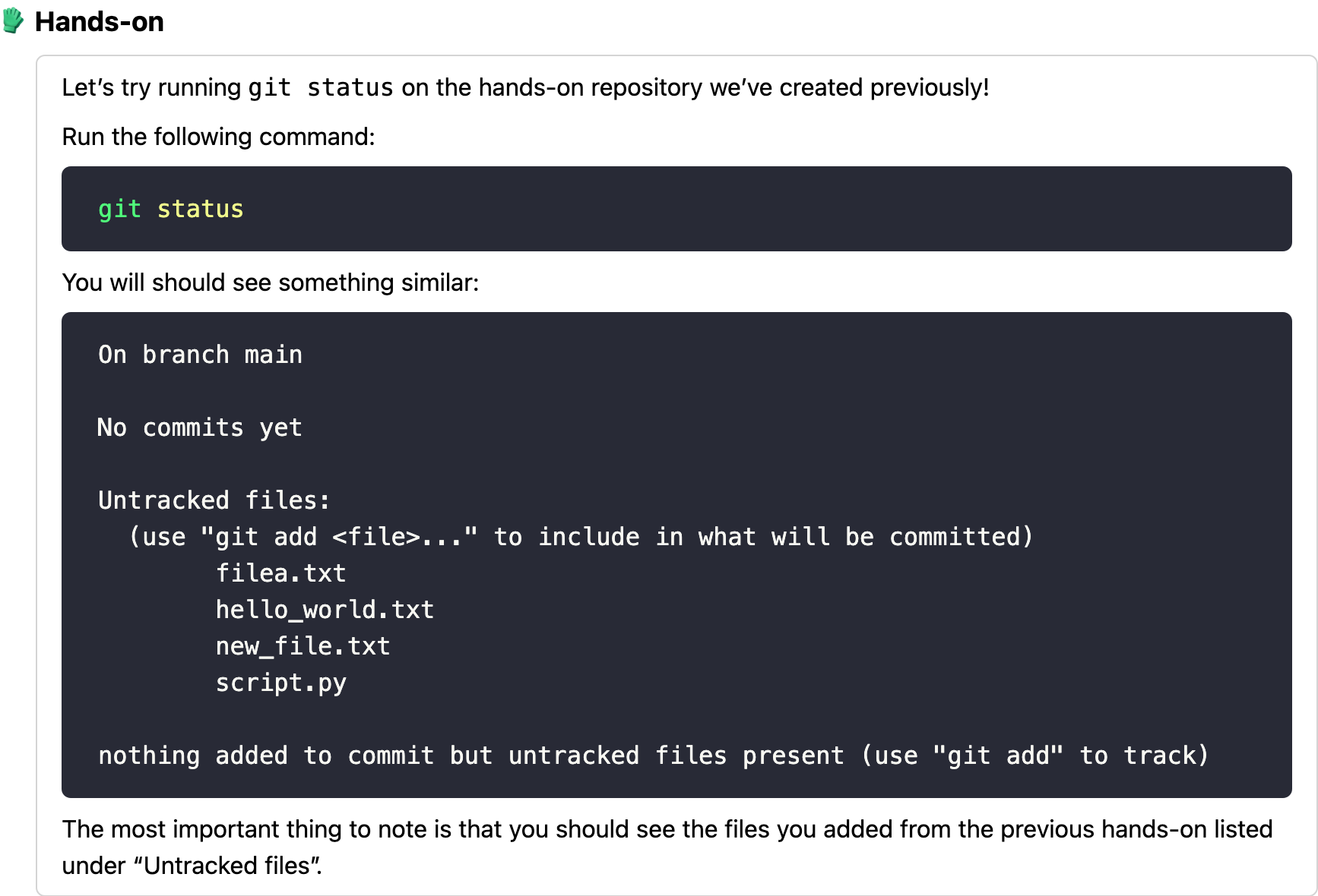 | Viewing repository status How does Git (and I) know what's happening in my repository? | 🧤 Hands-on: Using git status |