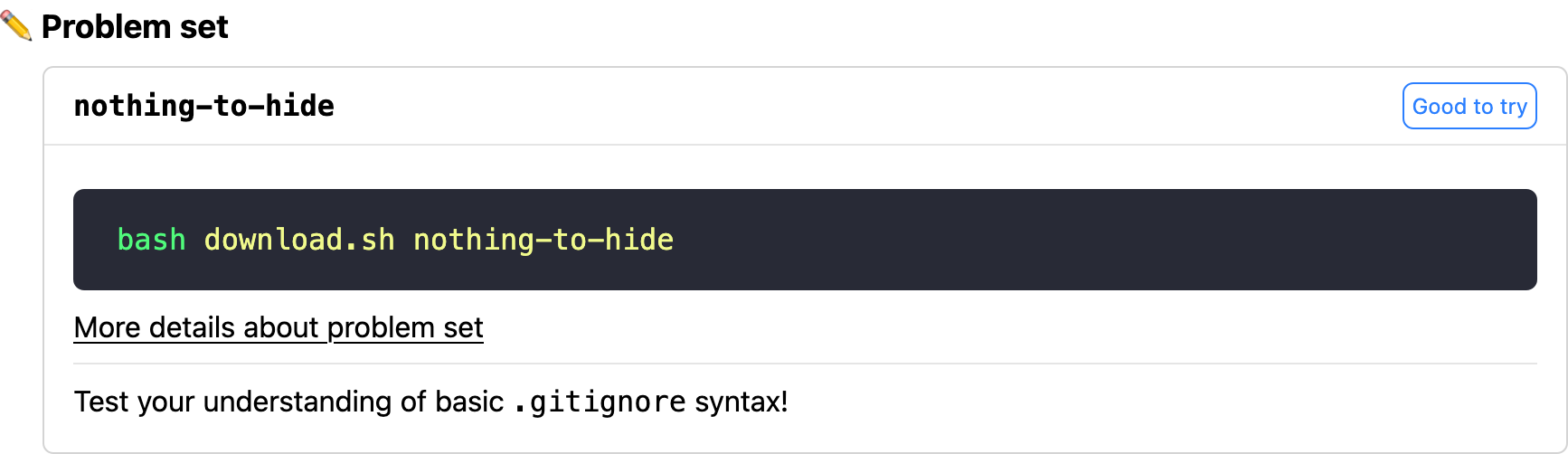 | Hiding files from Git What do you have to hide? 👀 | 🧤 Hands-on: Creating .gitignore 🛣️ Detour: .gitignore ✏️ Problem set: nothing-to-hide |
