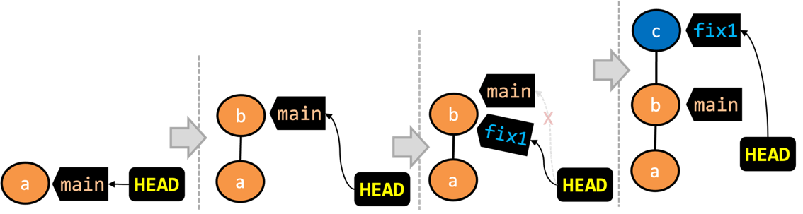 fix1has been added. The repo has switched to the new branch too (hence, theHEADref is now attached to thefix1branch). - A new commit (