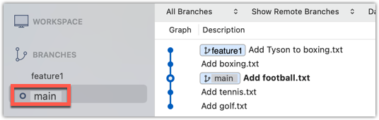 boxing.txt, stage it, commit it.echo -e "Muhammad Ali" > boxing.txt git stage boxing.txt git commit -m "Add boxing.txt" - Observe how commits you add while on