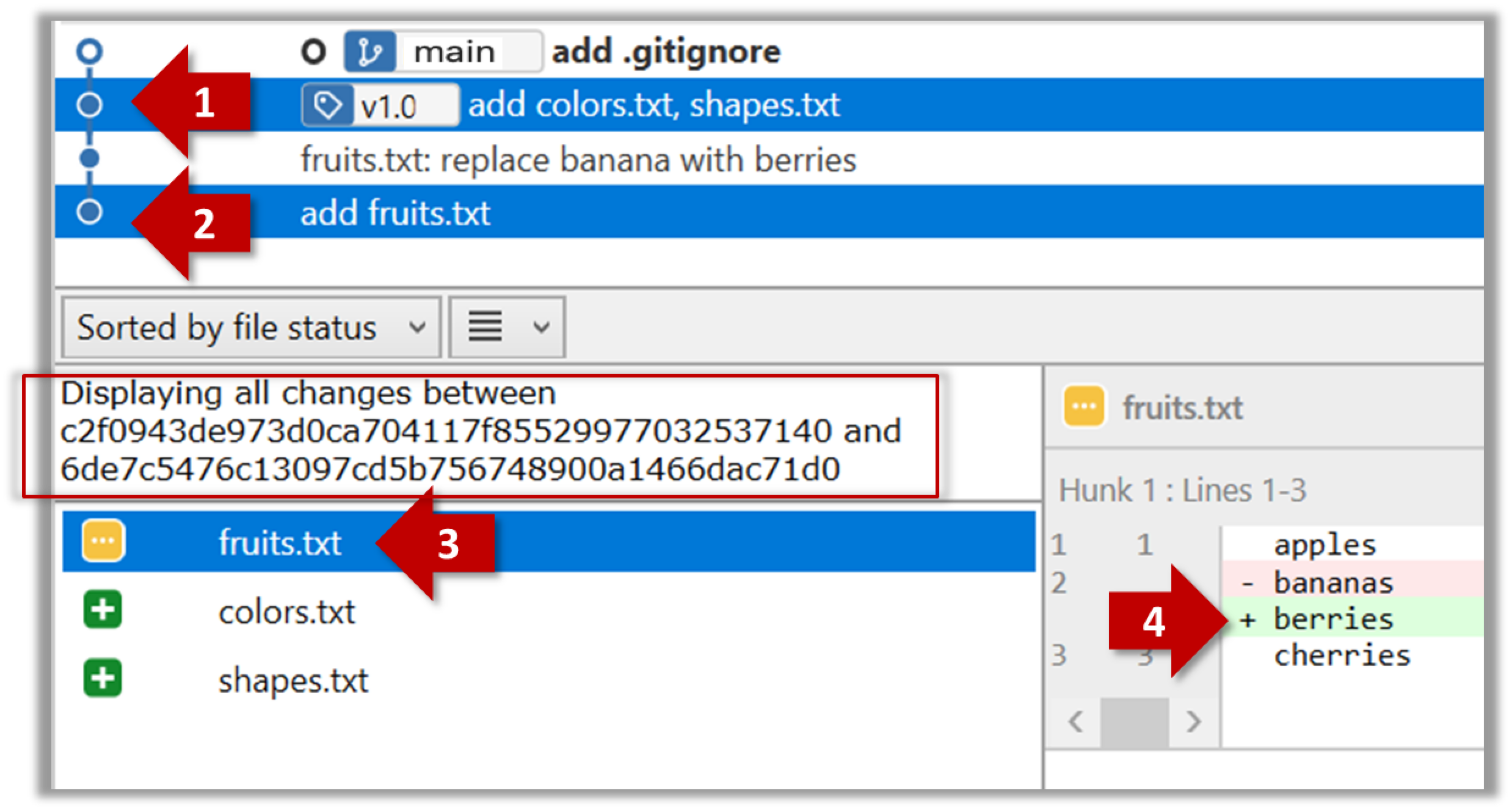 Select the two commits: Click on one commit, and Ctrl-Click (or Cmd-Click) on the second commit. The changes between the two selected commits will appear in the other panels, as shown below: