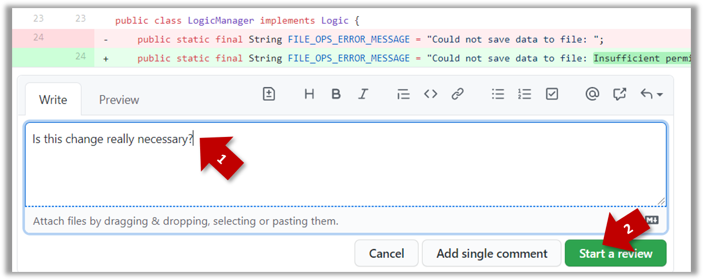 • After typing in the comment, click on the Start a review button (not the Add single comment button. This way, your comment is saved but not visible to others yet. It will be visible to others only when you have finished the entire review.