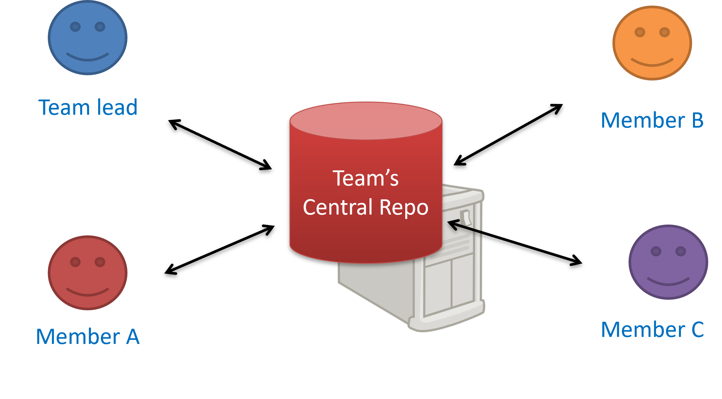 Centralized RCS use a single central (server-hosted) repository that is shared by the team. Developers check out a working copy, make changes locally, and then commit directly to the central repository. Instead of having their own copy of the entire repository history, they only have a working copy of files. One advantage of this model is having a clear and single "source of truth." One big disadvantage is that the central server becomes a critical dependency: if it's down, most operations (commits and history queries beyond the local working copy) are blocked. Older RCS tools such as CVS, Subversion, and Perforce follow this model.