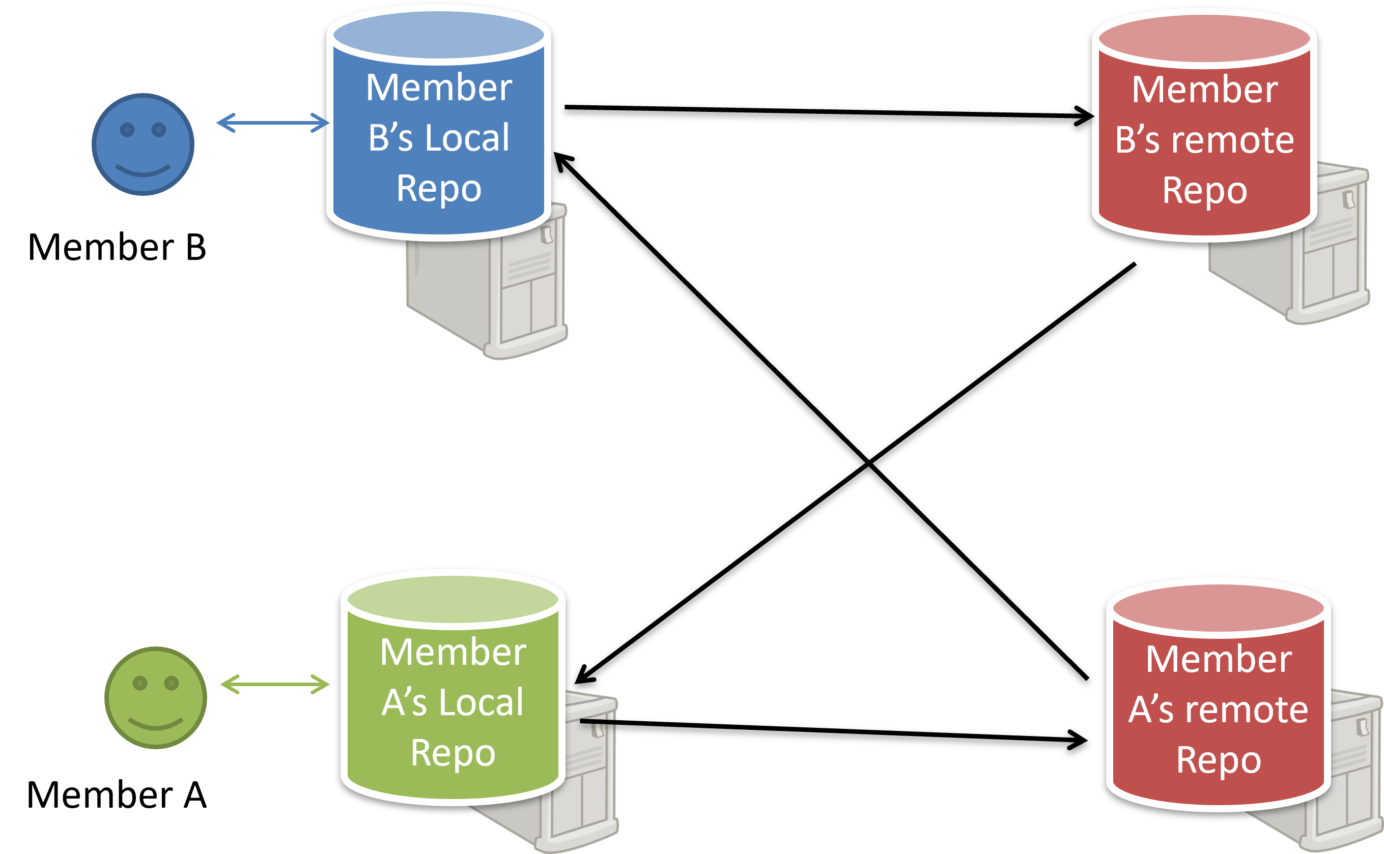 Distributed RCS (also known as decentralized RCS) allow multiple remote and local repositories to work together. The workflow can vary from team to team. For example, every team member can have their own remote repository in addition to a local repository. This architecture enables offline work, fast local operations, and more flexible workflows. It also supports multiple integration points (e.g., forks or alternative remotes) and uses cryptographic checksums to ensure history integrity. The trade-offs include more conceptual complexity (multiple repositories, remotes, and sync patterns) and the need for conventions to establish an authoritative integration flow. Git and Mercurial are prominent RCS tools that support the distributed approach.
