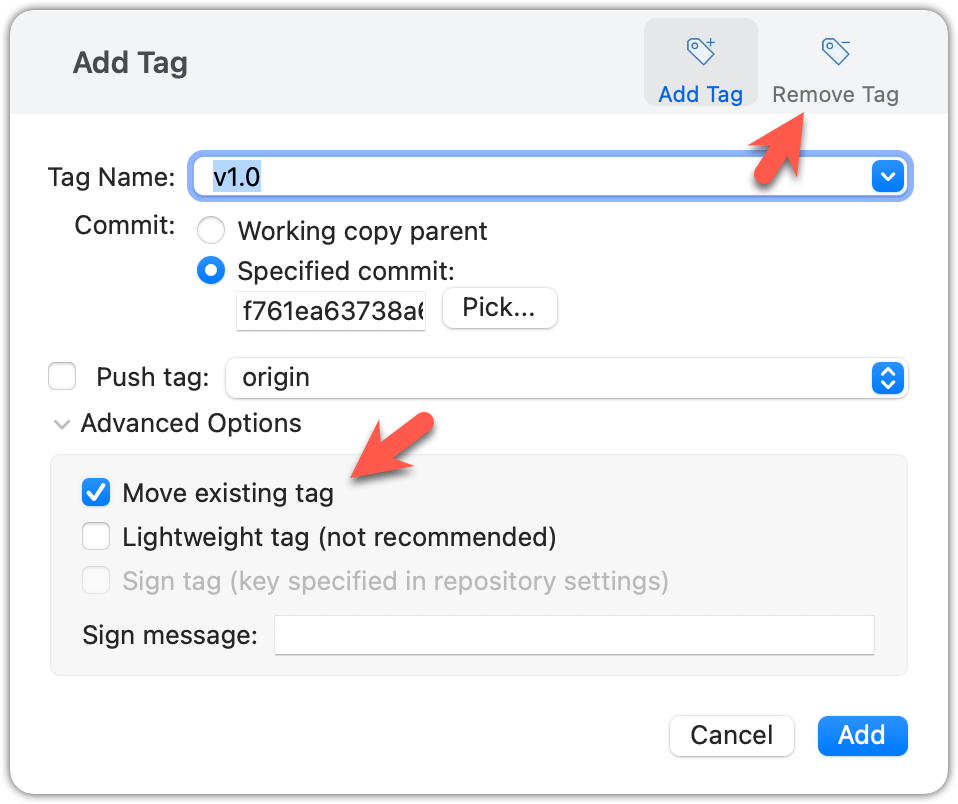 Configure tag properties in the next dialog and press Add. For example, you can choose whether to make it a lightweight tag or an annotated tag (default).