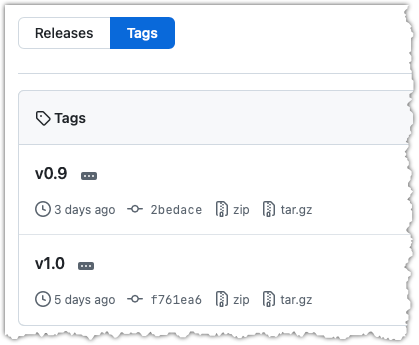 Note how GitHub assumes these tags are meant as releases, and automatically provides zip and tar.gz archives of the repo (as at that tag).