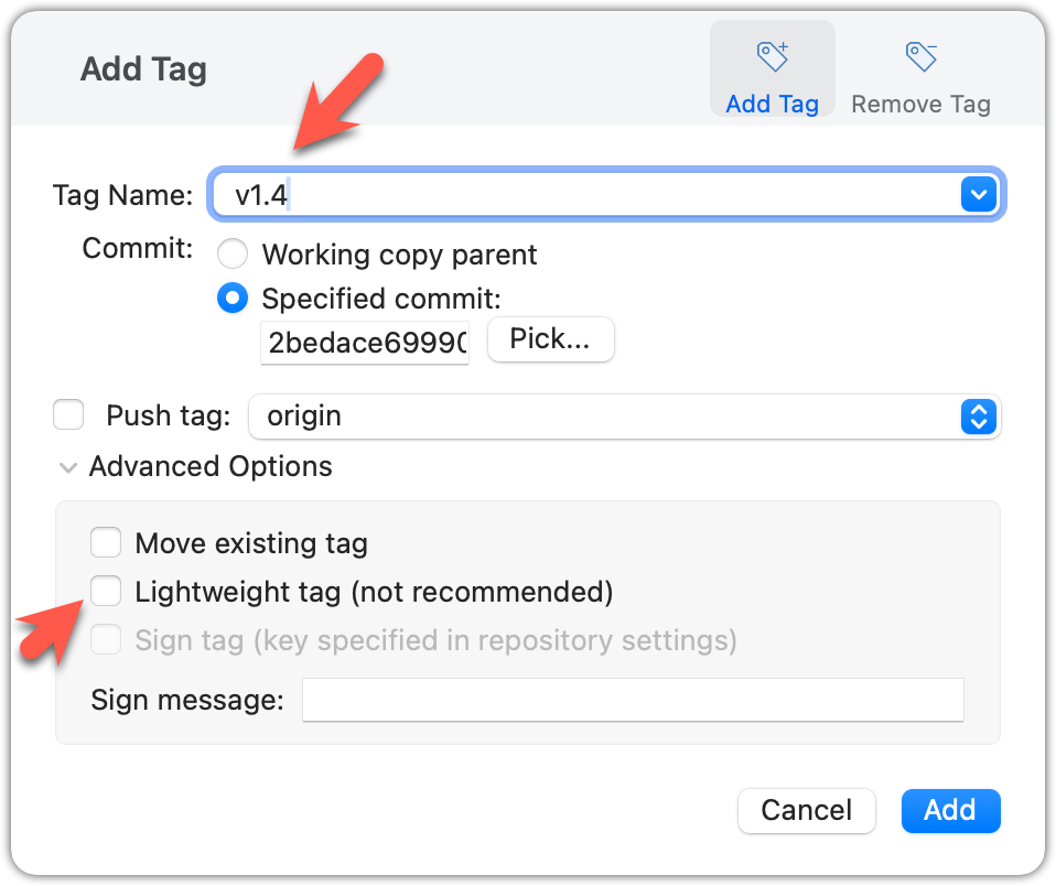Configure tag properties in the next dialog and press Add. For example, you can choose whether to make it a lightweight tag or an annotated tag (default).